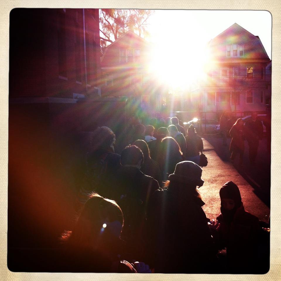 When the alarm went off at 6am, E. and I rose up like a shot. Where ordinarily the hazy dark blueness of our bedroom and layers of blankets – armor in our battle of wills against turning on the heat – serve to cushion us from the world, paralyzing us in a half-conscious snuggle, this morning we awoke amped, cadets with a mission. We made out each others’ dark silhouettes and reached in for a high-five. “Voting day!” we cried, and raced each other downstairs to make coffee.